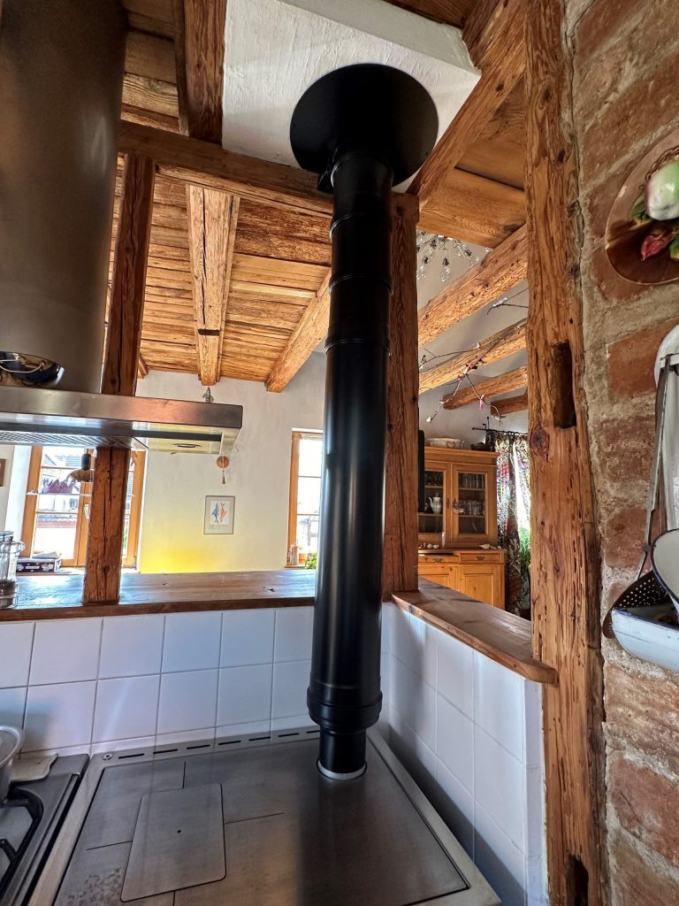Pour ce projet situé à Altorf, l’objectif était d’allier l’utile à l’agréable en installant une cuisinière à bois de la marque Duhamel. Ce type d’appareil, très prisé pour son authenticité, permet non seulement de chauffer efficacement la pièce de vie, mais offre également la possibilité de cuisiner au feu de bois de manière traditionnelle. Le défi consistait à intégrer cet équipement imposant et performant dans la cuisine, tout en assurant une évacuation des fumées optimale pour garantir une double fonction (chauffage et cuisson) irréprochable.