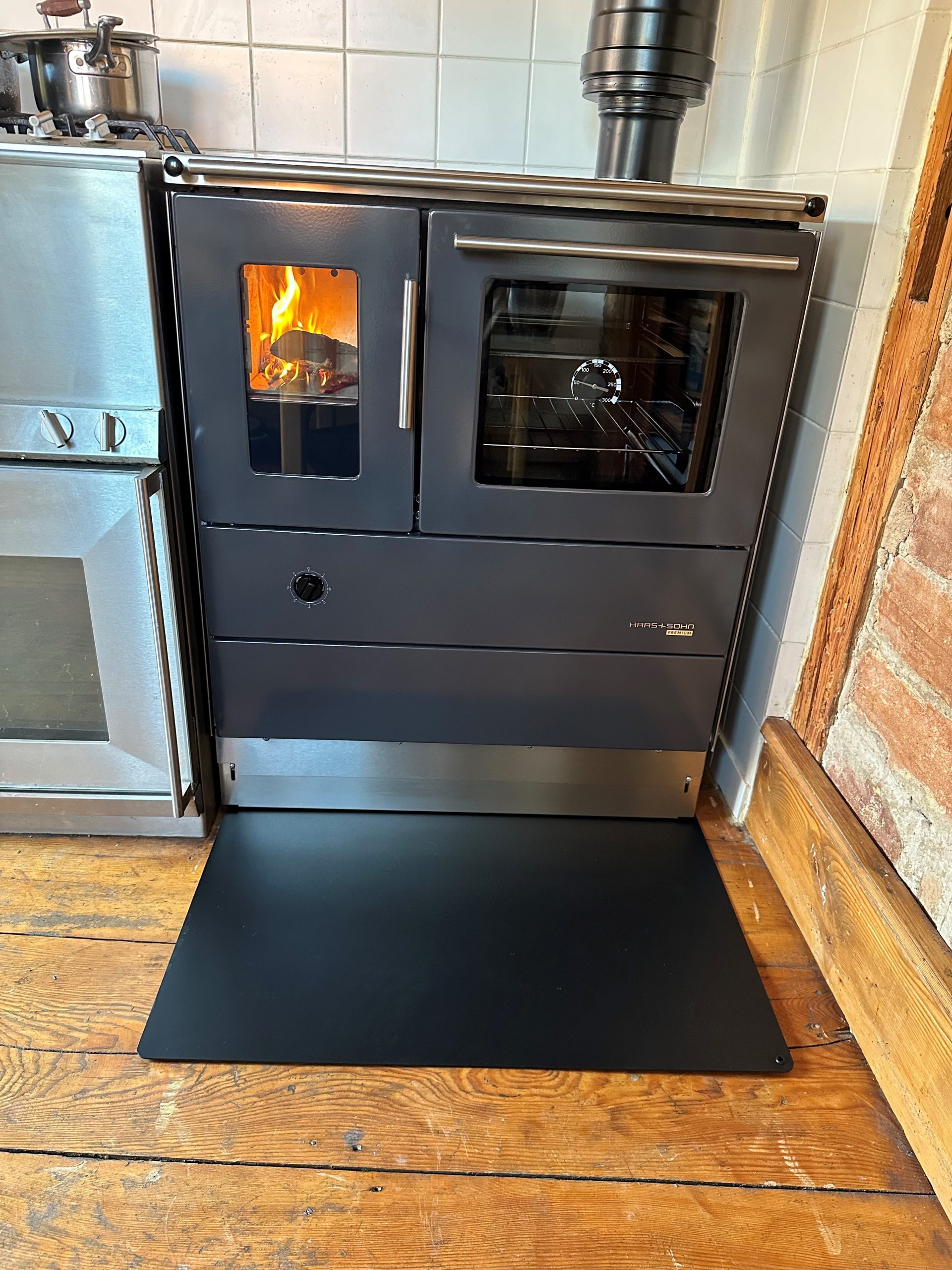 Pour ce projet situé à Altorf, l’objectif était d’allier l’utile à l’agréable en installant une cuisinière à bois de la marque Duhamel. Ce type d’appareil, très prisé pour son authenticité, permet non seulement de chauffer efficacement la pièce de vie, mais offre également la possibilité de cuisiner au feu de bois de manière traditionnelle. Le défi consistait à intégrer cet équipement imposant et performant dans la cuisine, tout en assurant une évacuation des fumées optimale pour garantir une double fonction (chauffage et cuisson) irréprochable.